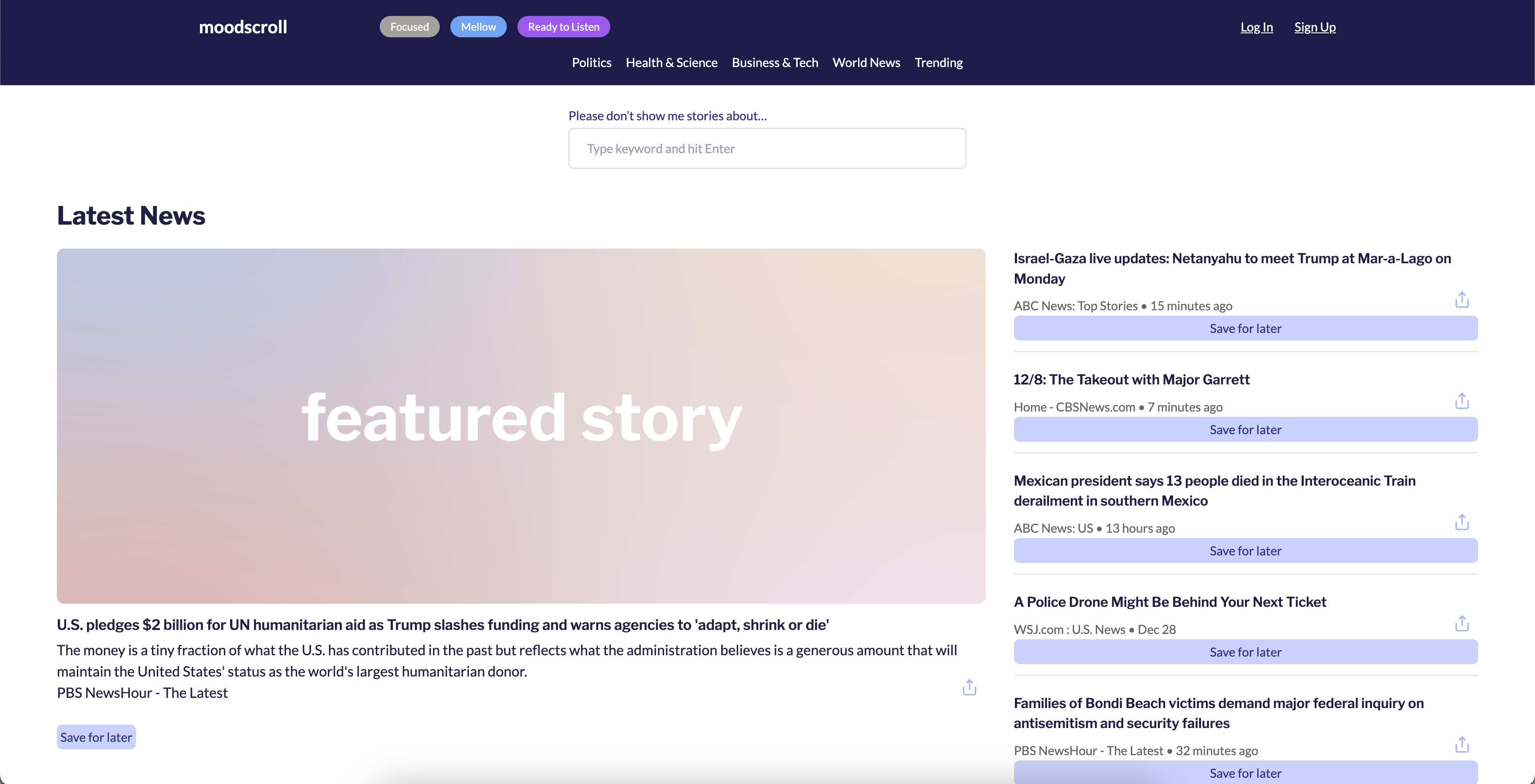 Moodscroll is a mood-based news platform I designed and built to offer a more intentional alternative to doomscrolling. Drawing on my background in digital media, I wanted to rethink how people engage with the news — not by avoiding it, but by giving users more control over how and when they consume it. The app organizes news into distinct mood-driven experiences, allowing users to choose whether they want focused, essential coverage, gentler feel-good stories, or AV-forward content they can listen to or watch instead of scroll. Rather than relying on algorithmic feeds, Moodscroll uses curated sources and thoughtful presentation to prioritize clarity, balance, and emotional sustainability. From concept and product design to front-end development and content architecture, I led every aspect of the project. I built the interface using modern web technologies, implemented dynamic feeds and serverless functions for content aggregation, and designed the experience to feel calm, approachable, and human. Moodscroll ultimately reflects my belief that good design and storytelling can help people stay informed without feeling overwhelmed.