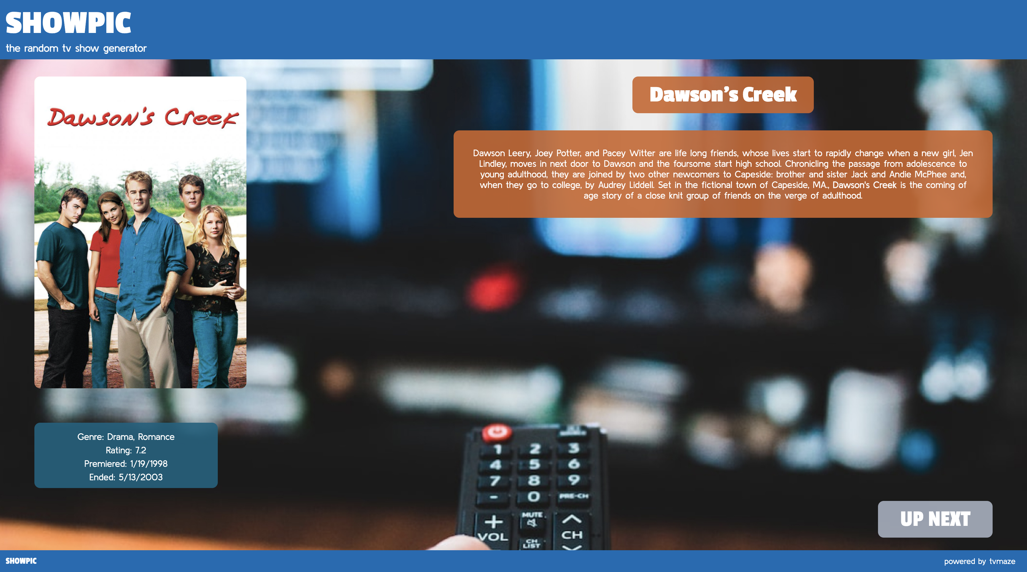I created a random TV show generator, a web project designed to spice up your viewing choices with a bit of serendipity. Built with sleek, responsive design, this site uses JavaScript to randomly select a TV show from a vast database, presenting users with the show's title, a brief synopsis, and an image. It's perfect for those evenings when you just can't decide what to watch—let Showpic make the choice and discover something new!